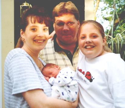 Here I am with my WHOLE family. That's my Mommy, Daddy, and sister, Sara. This picture was taken at our house when my parents had a picnic to welcome me into the world. I'm about two weeks old in this picture.