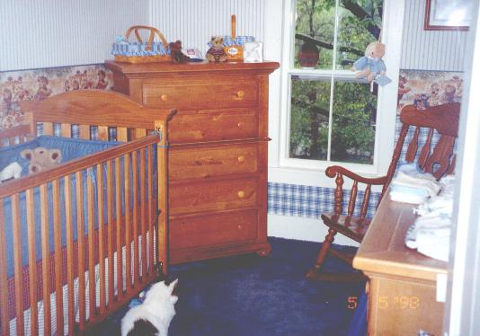This is a picture of my room (or the nursery) facing into the room from the doorway. See my Kitty cat, Figaro, on the floor? I love to pull her tail now that I'm a big boy!