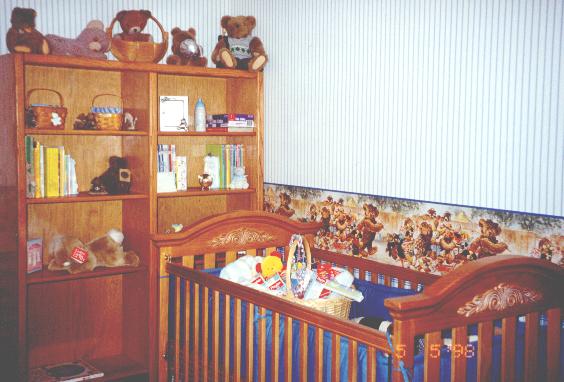 This is another picture of my room. This time it's taken from inside the room facing the doorway (the door is right next to the shelves). Don't you like the teddy bears on top of my shelves that used to belong to my parents?